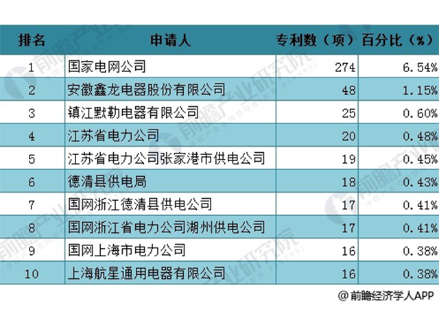 在專利技術申請人排名前十中,國家電網公司一家獨大,截至2018年5月底,申請專利達到274項,占全國申請專利的6.54%;排在第二的安徽鑫龍電器股份有限公司專利申請量只有48項,占比為1.15%;其他公司申請專利量不到30項。