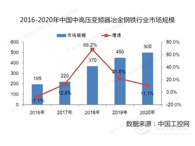 中高壓變頻器在冶金鋼鐵行業(yè)的應(yīng)用分為前端和后端二部分。前端主要用于燒結(jié)主抽風(fēng)機、煉鐵環(huán)節(jié)引風(fēng)機、循環(huán)風(fēng)機、高爐風(fēng)機等;后端主要有板材和線材的軋機、卷取機、風(fēng)機、料漿泵等,主要以電機節(jié)能為目的。2020年冶金鋼鐵行業(yè)中高壓通用變頻器市場規(guī)模為5億元,市場體量較大,前景較為廣闊。