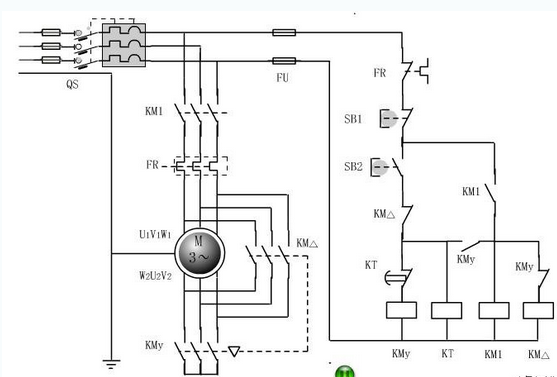 如上圖所示是用按鈕和接觸器控制的星三角降壓啟動的 控制電路。該線路 使用了三個接觸器、一個熱繼電器和三個按鈕。接觸器KM作引入電源用,接觸器KMy和KM△分別作星形啟動用和三角形運行用,SB1是啟動按鈕,SB2是星~三角轉(zhuǎn)換按鈕,SB3是停止按鈕,熔斷器FU1作為主電路的短路保護,熔斷器FU2作為控制電路的短路保護,F(xiàn)R作過載保護。