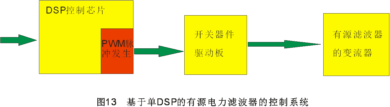 我們可以選擇不同的數(shù)字控制系統(tǒng)來實現(xiàn)。通常的控制系統(tǒng)一般有基于單數(shù)字信號處理芯片的帶有PWM信號的控制系統(tǒng),即如圖13所示的控制系統(tǒng)。由于DSP本身帶有PWM脈沖產(chǎn)生部分,因此采用單片的DSP就可以實現(xiàn)有源電力濾波器的控制系統(tǒng)。
