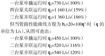 泵或風機并聯運行的主要目的是增大所輸送的流量。但流量增加的幅度大小與管路性能曲線的特性及并聯臺數有關。圖1所示為兩臺及三臺性能相同的20Sh-13型離心泵并聯時,在不同陡度管路性能曲線下流量增加幅度的情況,從圖可見,當管路性能曲線方程為