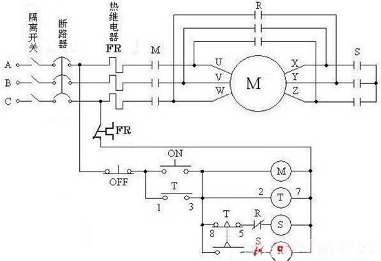斷路器----按下ON啟動按鈕---M,S,T得電---M接通主回路,S通過T的常閉觸點及R的常閉觸點得電---S主回路接通--正在做起動運轉過程。